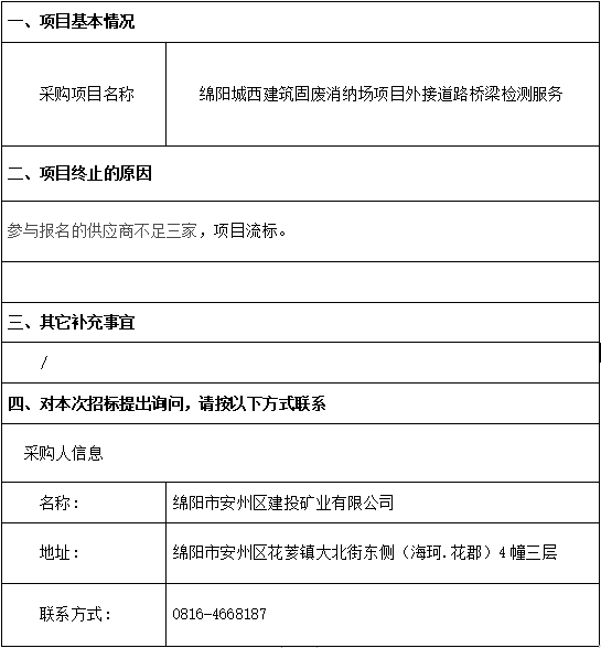 綿陽(yáng)城西建筑固廢消納場(chǎng)項(xiàng)目外接道路橋梁檢測(cè)服務(wù)流標(biāo)公告